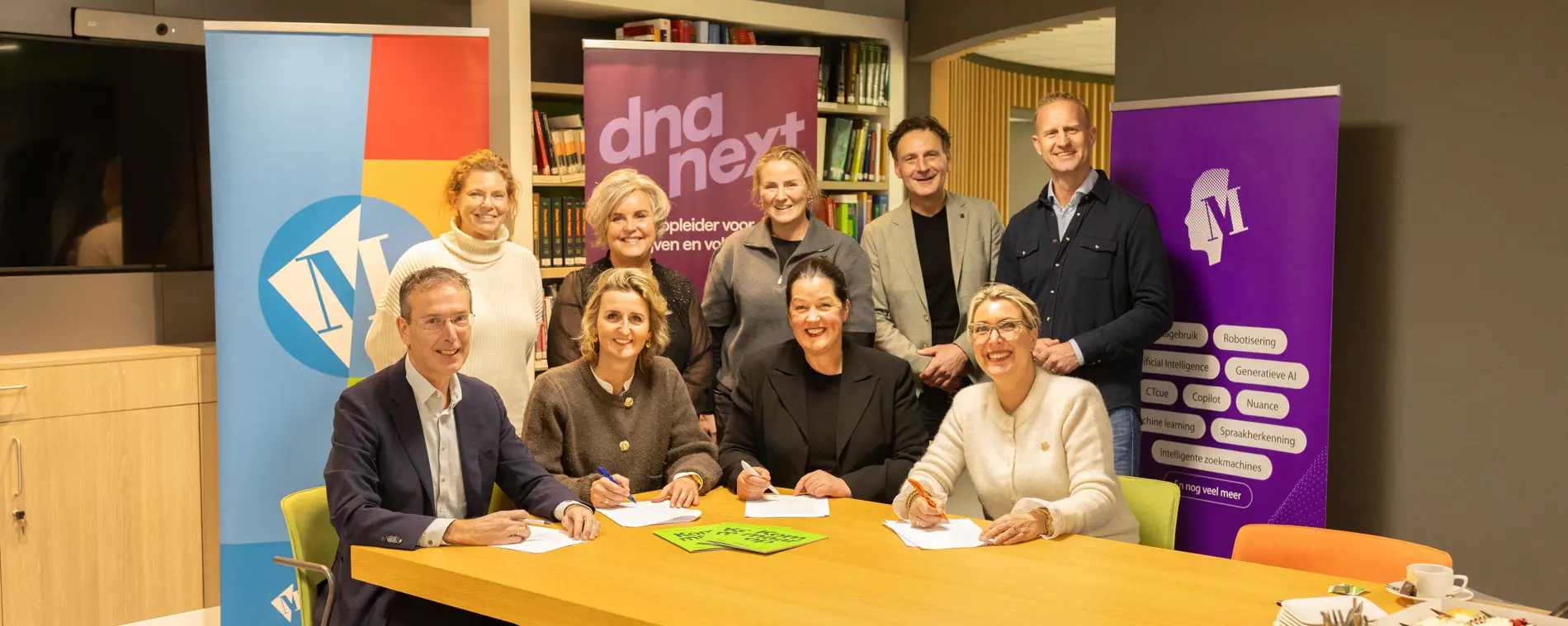 Het tekenmoment, v.l.n.r.: Enno van der Werff (Alfa-college), Fleurisca Korteweg (Martini Ziekenhuis), Gerda Dekker (Noorderpoort), Mare Riemersma (DCTerra). (Fotograaf: Stella Dekker)